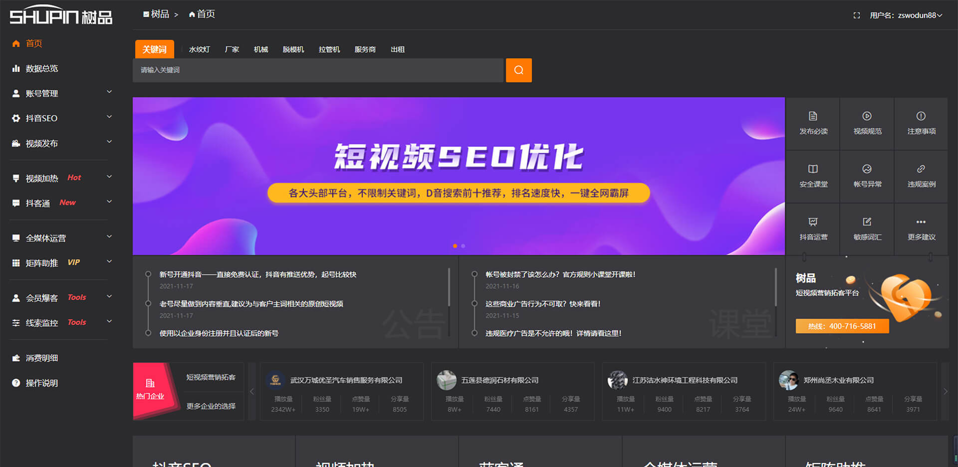 幫助企業解決在短視頻營銷中的內容生產、賬號搭建、賬號運營 、精準低成本引流、業務場景、服務場景、服務效率等問題的短視頻營銷拓客平臺。